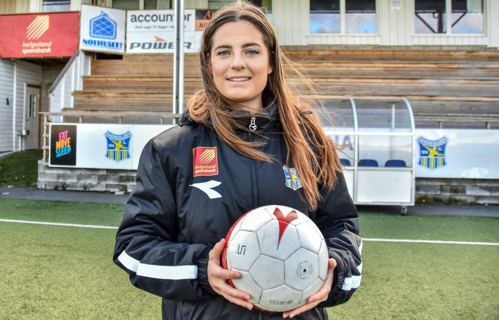 På bildet: Maja Trondsdatter Bonsaksen fra Sandnessjøen er årgangsansvarlig i Norges Fotballforbund for 2008-årgangen, og assistenttrener for J15-landslaget i år. Hun er også hovedtrener på Equinor Talentleir i Sarpsborg. Foto: Snorre Nicolaisen