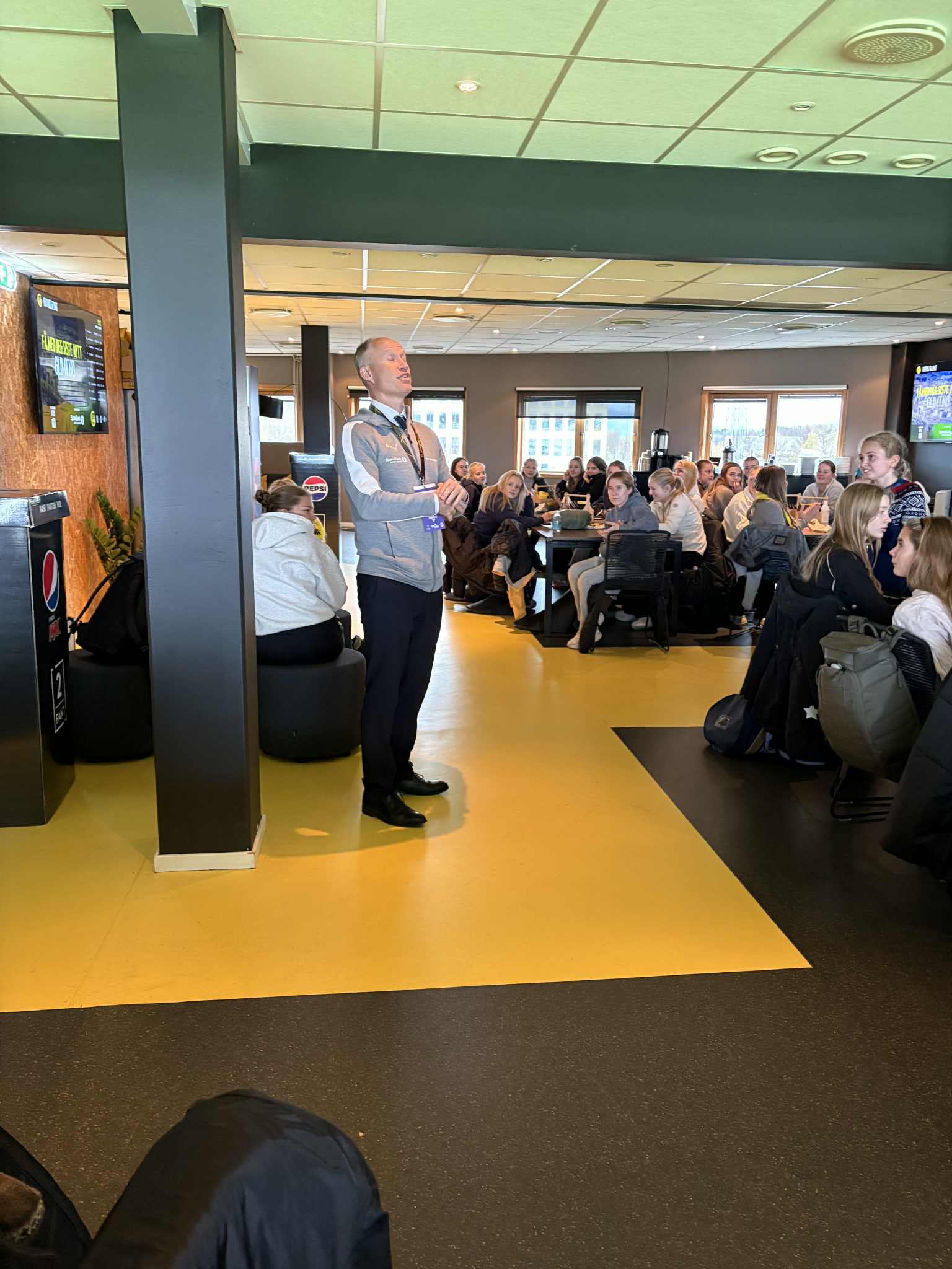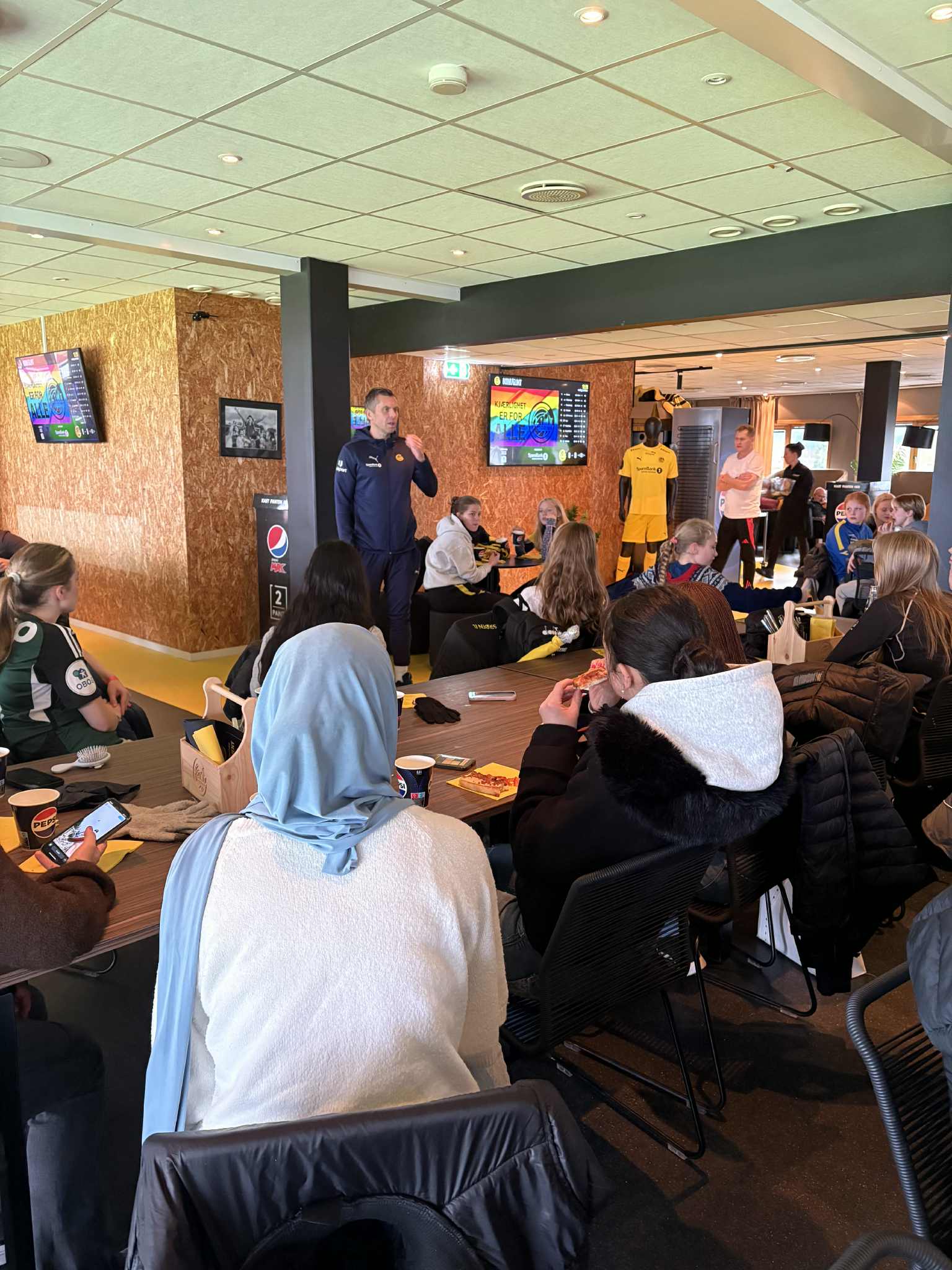 Når vi kommer oss opp i Sportsbaren, så blir vi velkommet av Runar, som er selve bildet på en godt vert! Stian kommer innom og forteller om kampplanen mot Rosenborg, og svarer på noen spørsmål fra jentene før han må ned i garderoben og gjøre siste innsats inn mot kampstart. Vi er da så utrolig heldig at Tale og Lærke, som dessverre begge er skadet, kommer på besøk til oss.
